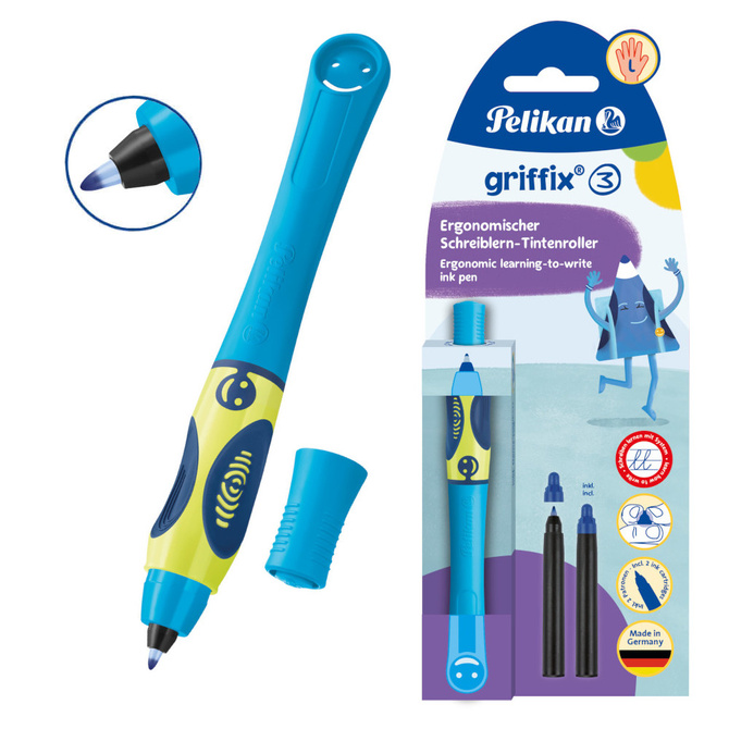 Pióro kulkowe Griffix 3 zostało zaprojektowane specjalnie dla dzieci leworęcznych, aby ułatwić im naukę pisania w naturalny, wygodny sposób. To część wyjątkowego systemu Griffix, opracowanego we współpracy z ekspertami z Instytutu Fraunhofera, który wspiera rozwój umiejętności pisania krok po kroku.