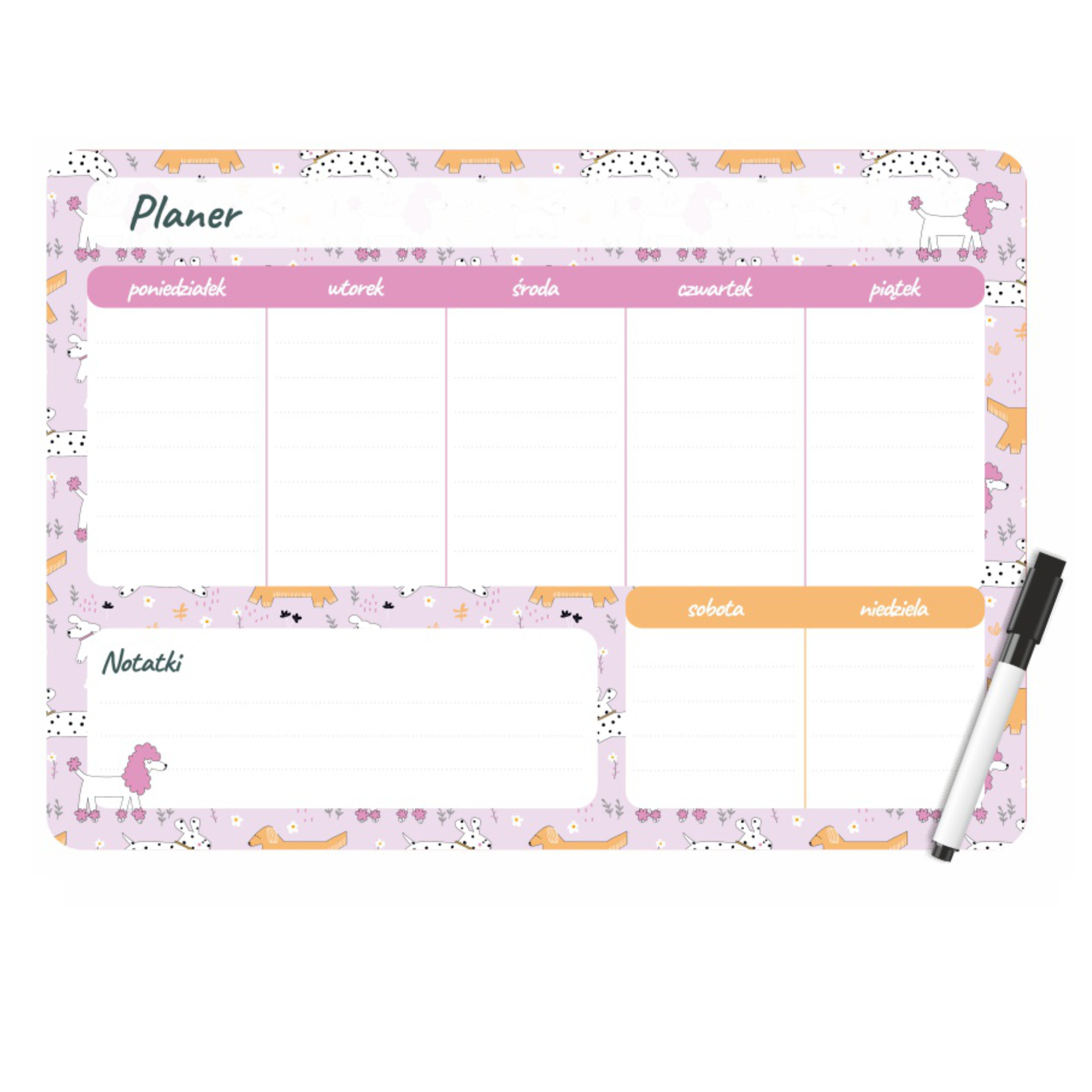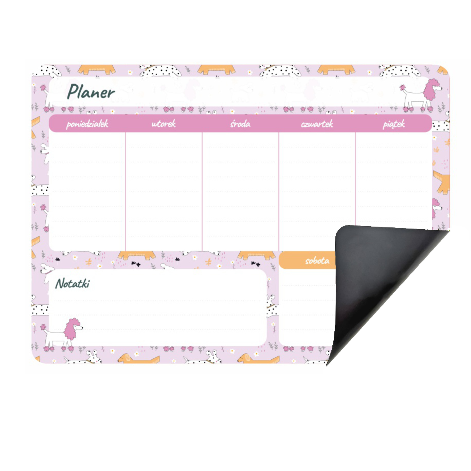 Planer tygodniowy z motywem słodkich piesków to idealna pomoc w codziennej organizacji dla dzieci i miłośników czworonogów! Kolorowy wzór zachęca do planowania, a magnetyczny tył pozwala łatwo umieścić go na lodówce lub tablicy.