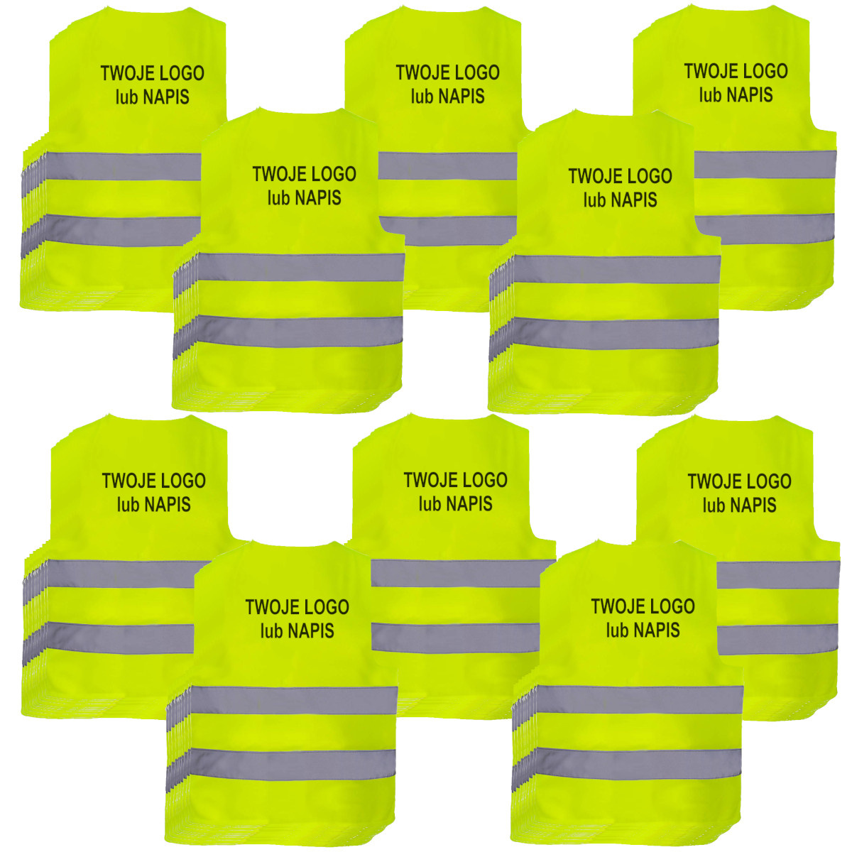 - Oferta dotyczy kamizelek odblaskowych dla dorosłych z jednostronnym nadrukiem (na piersi lub plecach) logo lub własny tekst