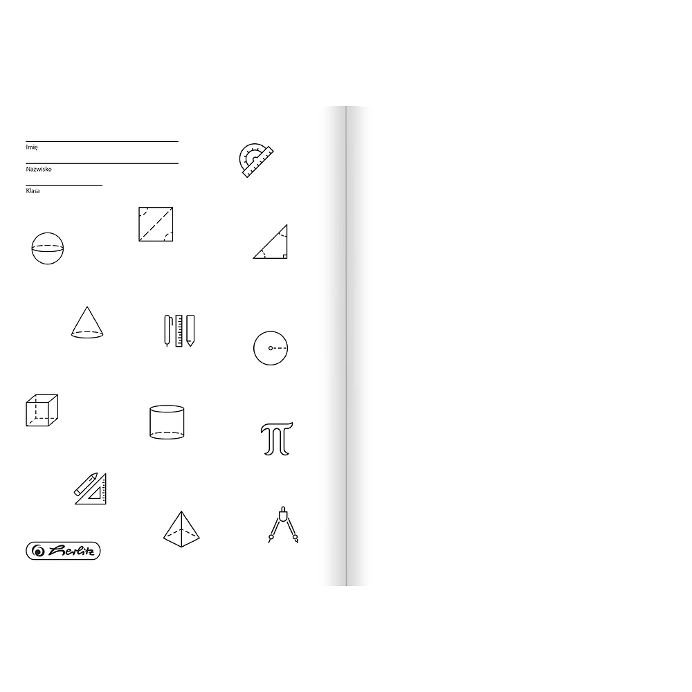 - Z przodu, wewnątrz okładki miejsce na podpis oraz rysunki przyborów geometrycznych i figur