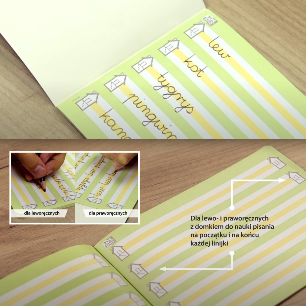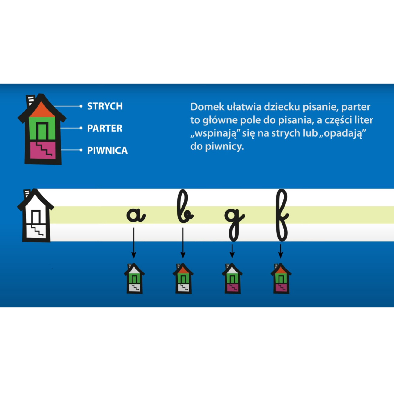 - Domek na początku i końcu każdej linijki ułatwia dziecku naukę pisania