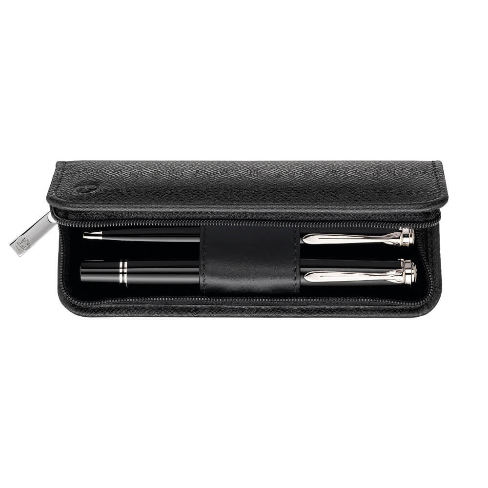 - Etui pomieści dwa dowolne przybory piśmiennicze, które są zabezpieczone wytrzymałymi gumkami