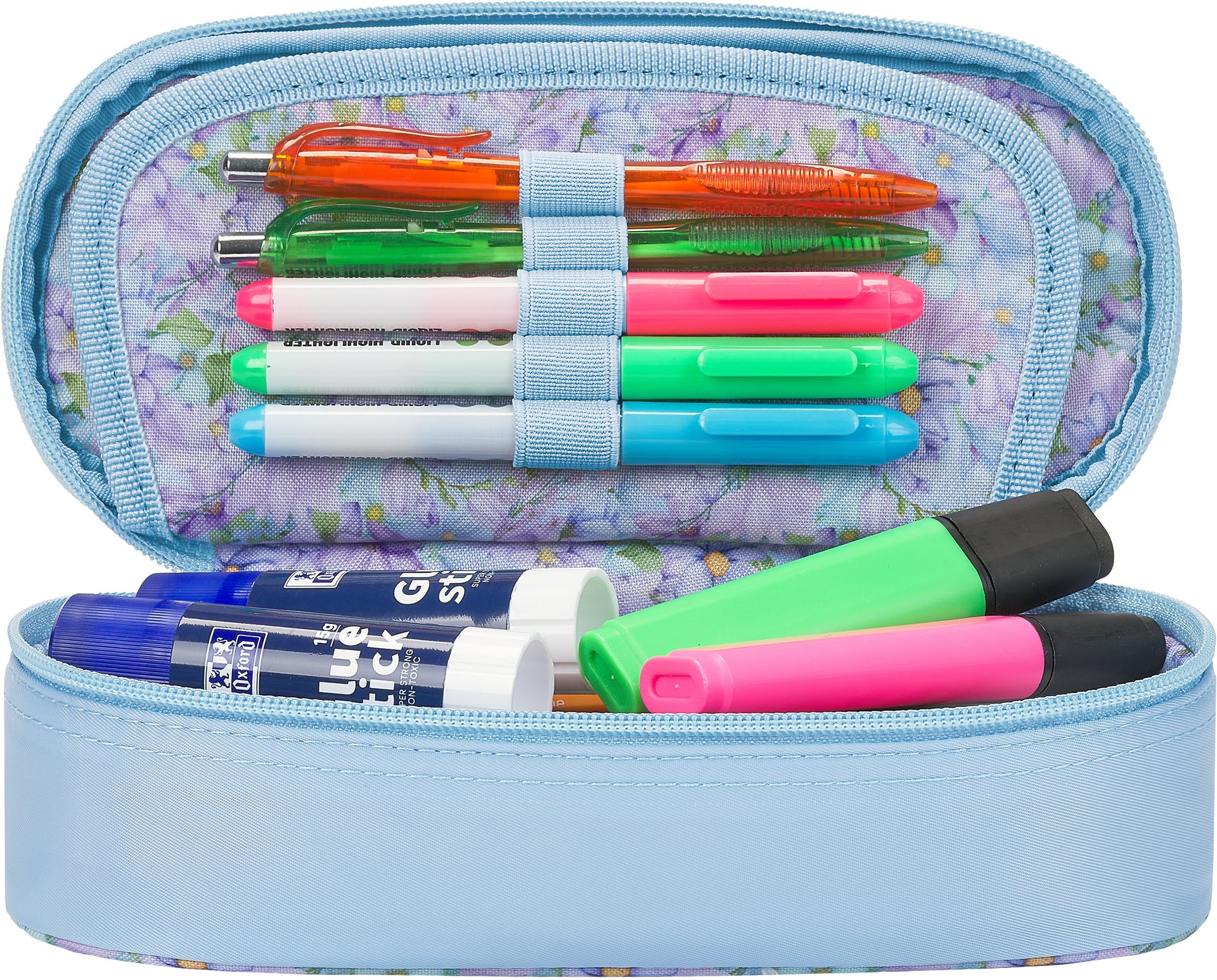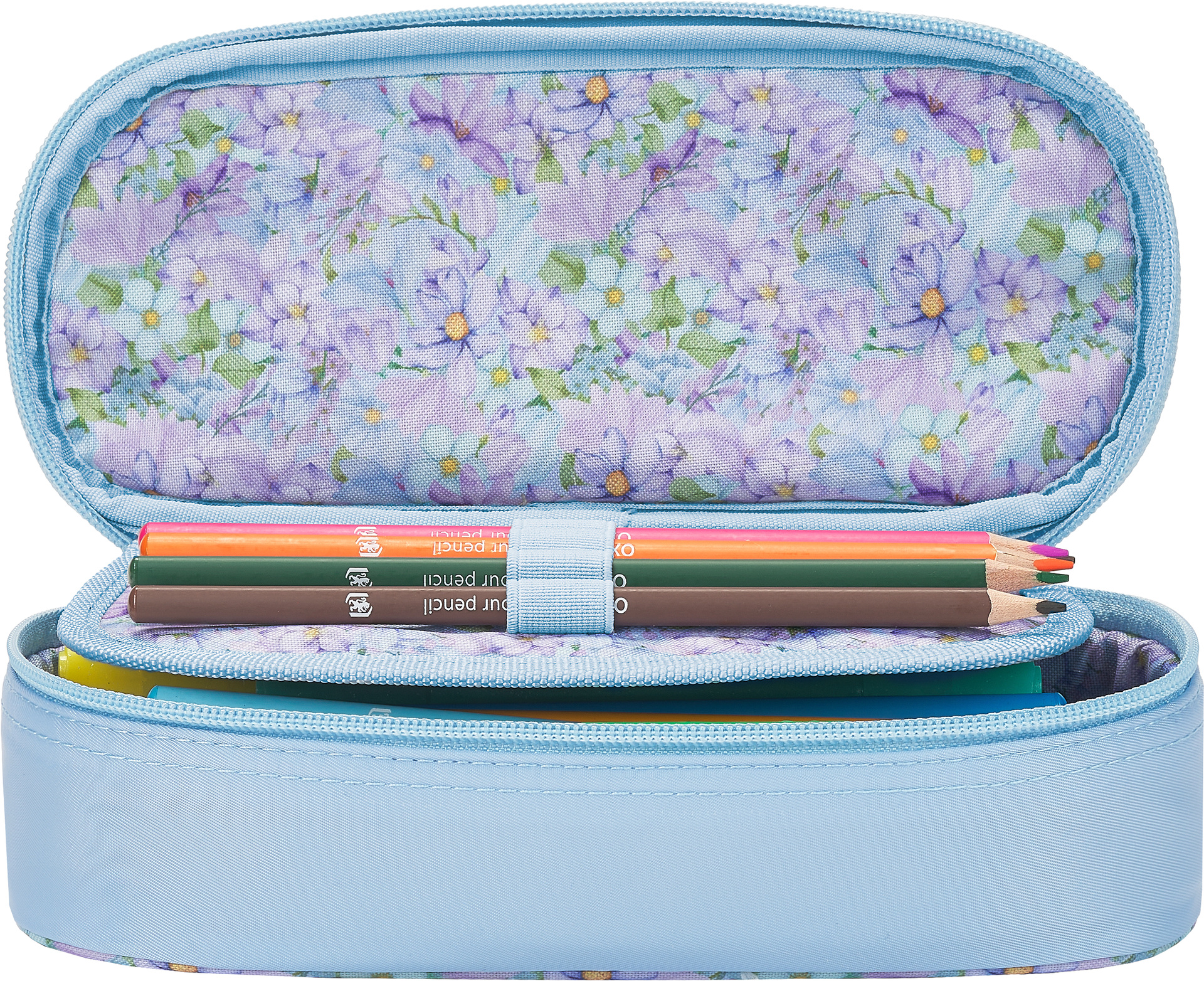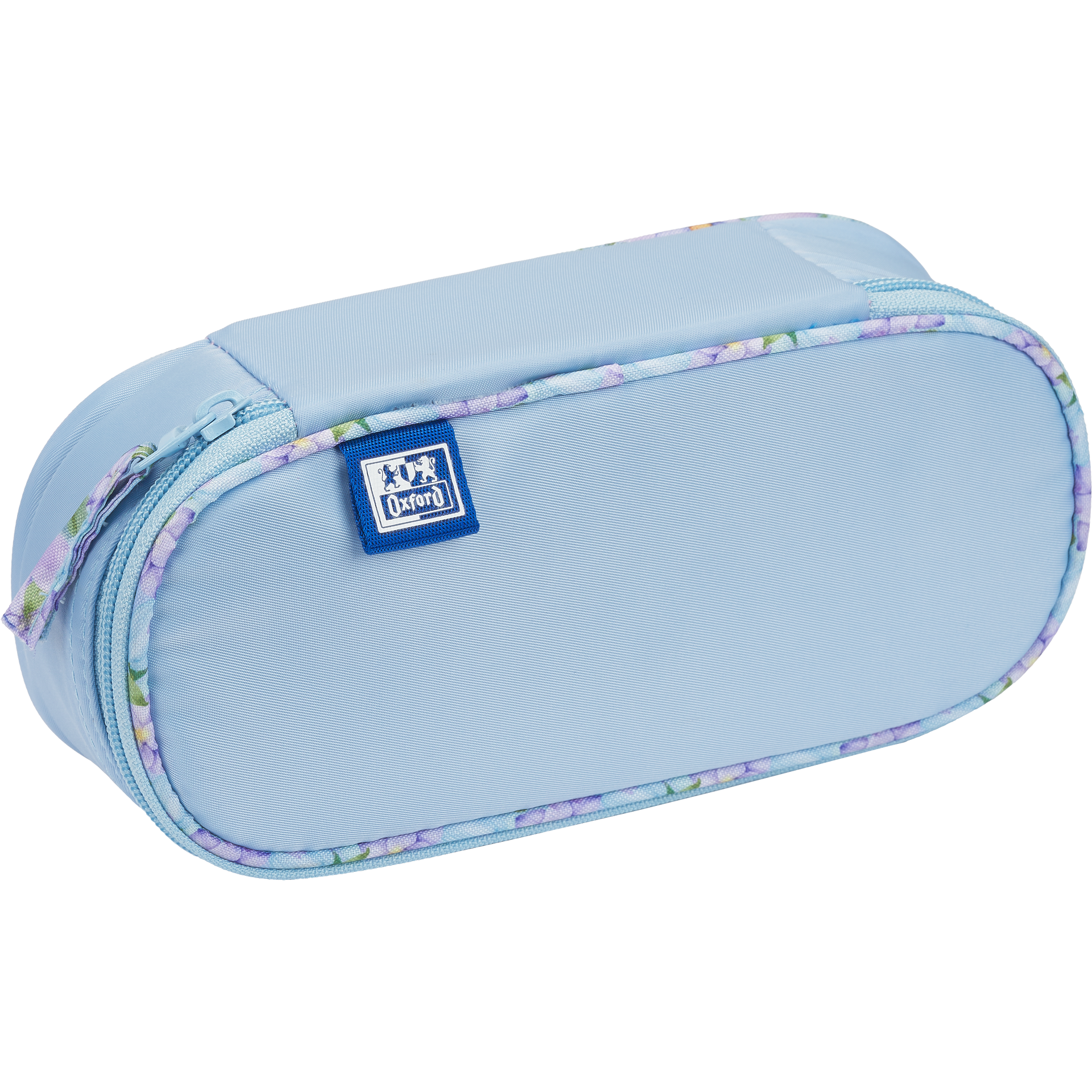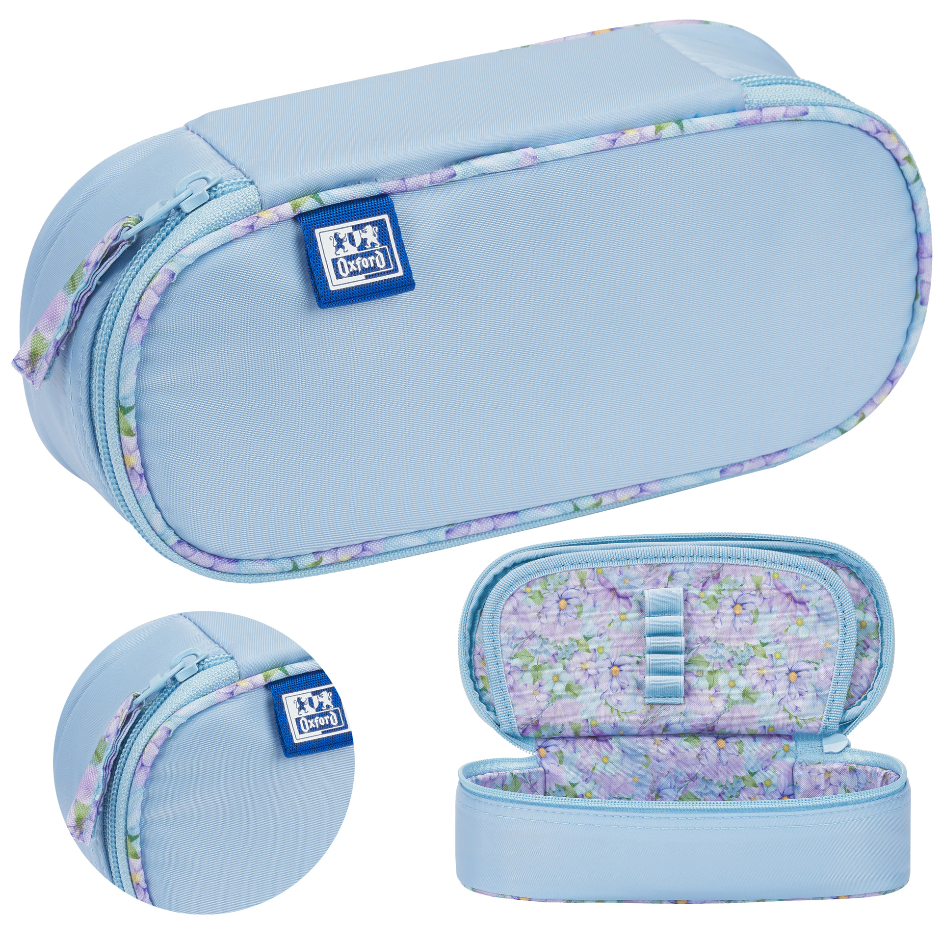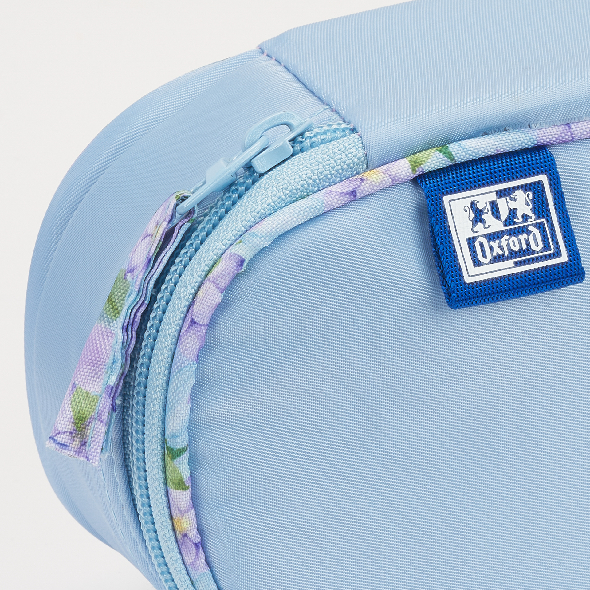 Stylowy piórnik w odcieniu błękitu z kwiatowym wnętrzem to idealny wybór dla uczniów i uczennic, którzy cenią elegancję, funkcjonalność i estetyczne detale. Model z serii Oxford Flowers łączy subtelność pastelowego koloru z praktycznym wnętrzem.