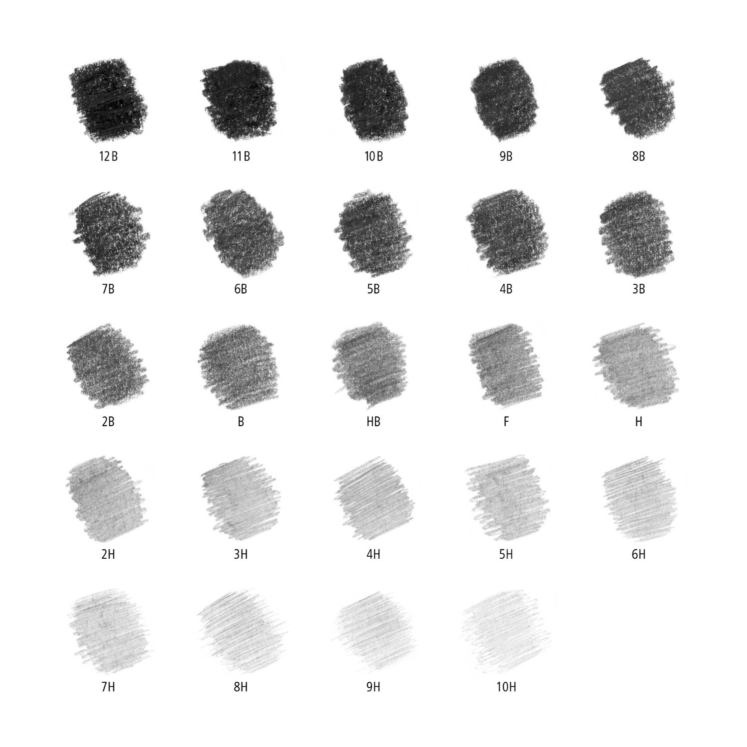 24 ołówki o twardościach: 12B, 11B, 10B, 9B, 8B, 7B, 6B, 5B, 4B, 3B, 2B, B, HB, F, H, 2H, 3H, 4H, 5H, 6H, 7H, 8H, 9H