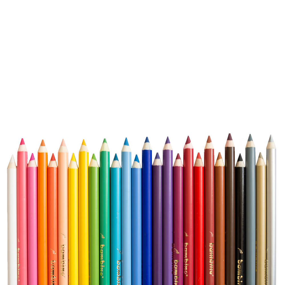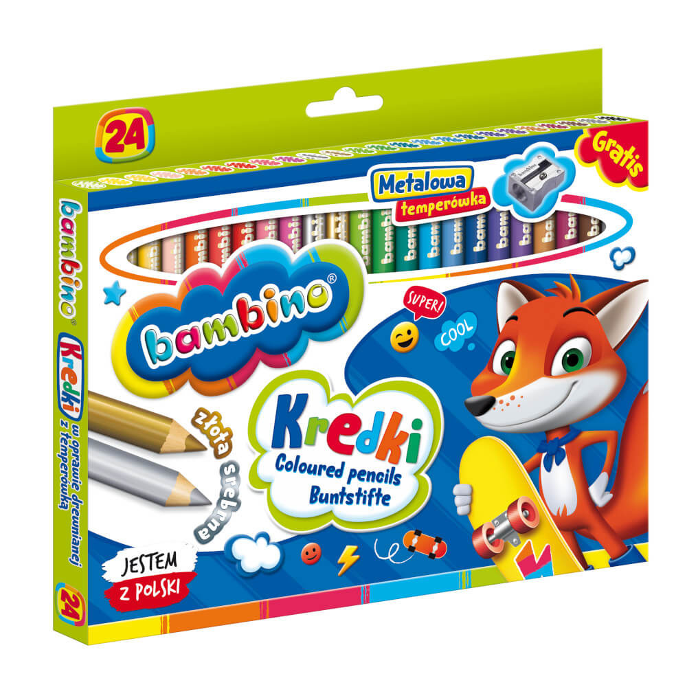 🖍️ Kredki BAMBINO w oprawie drewnianej z temperówką – 24 kolory, w tym złota i srebrna + temperówka