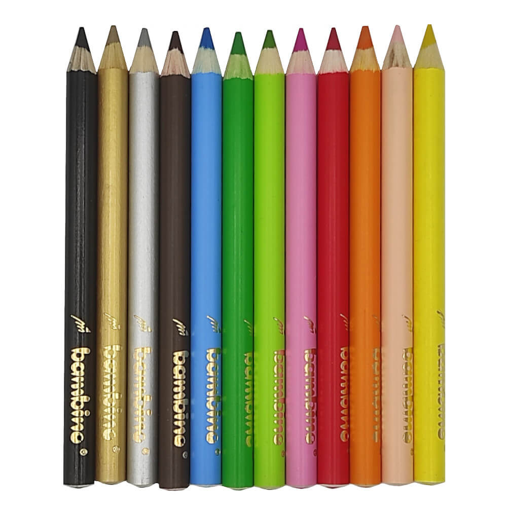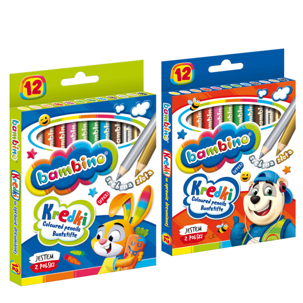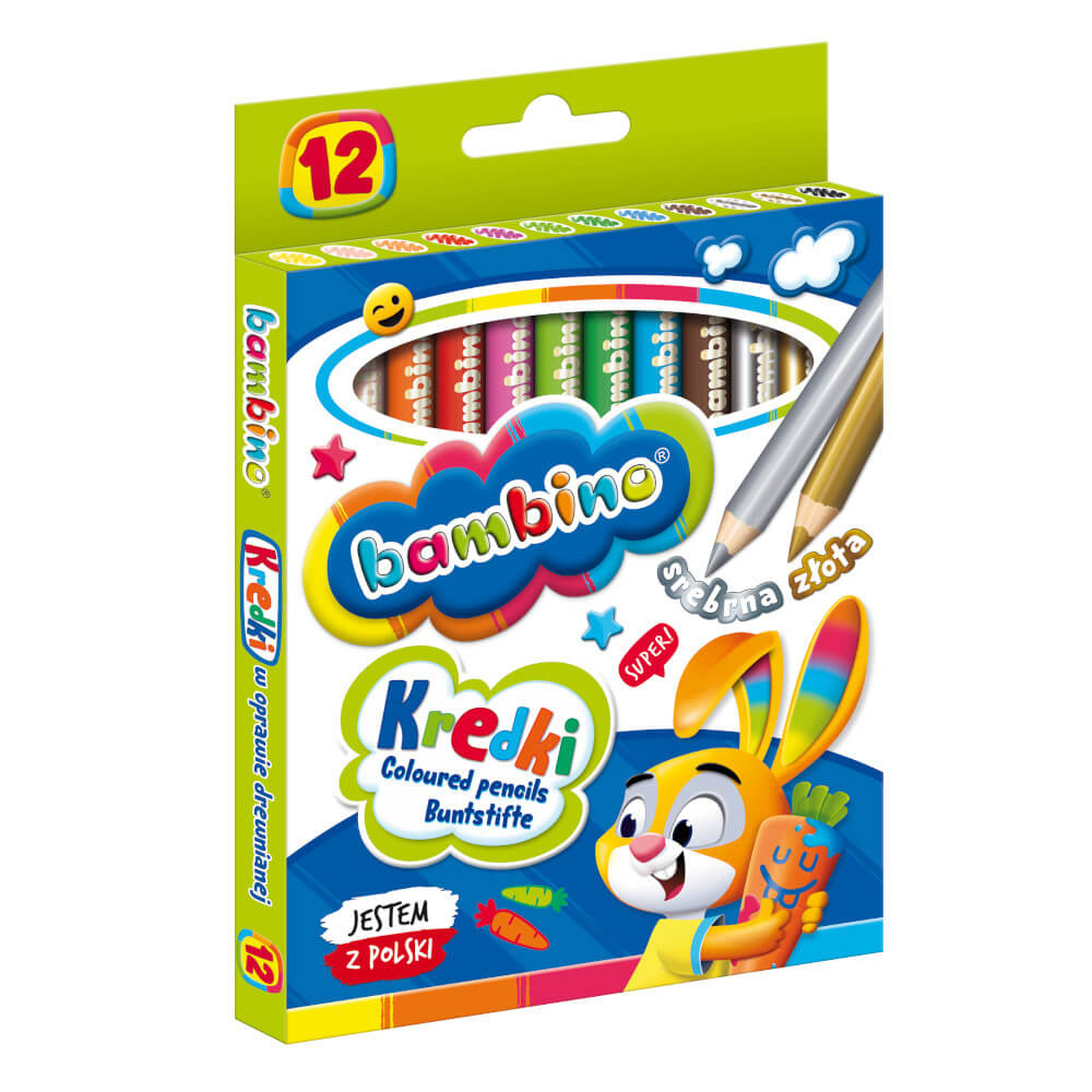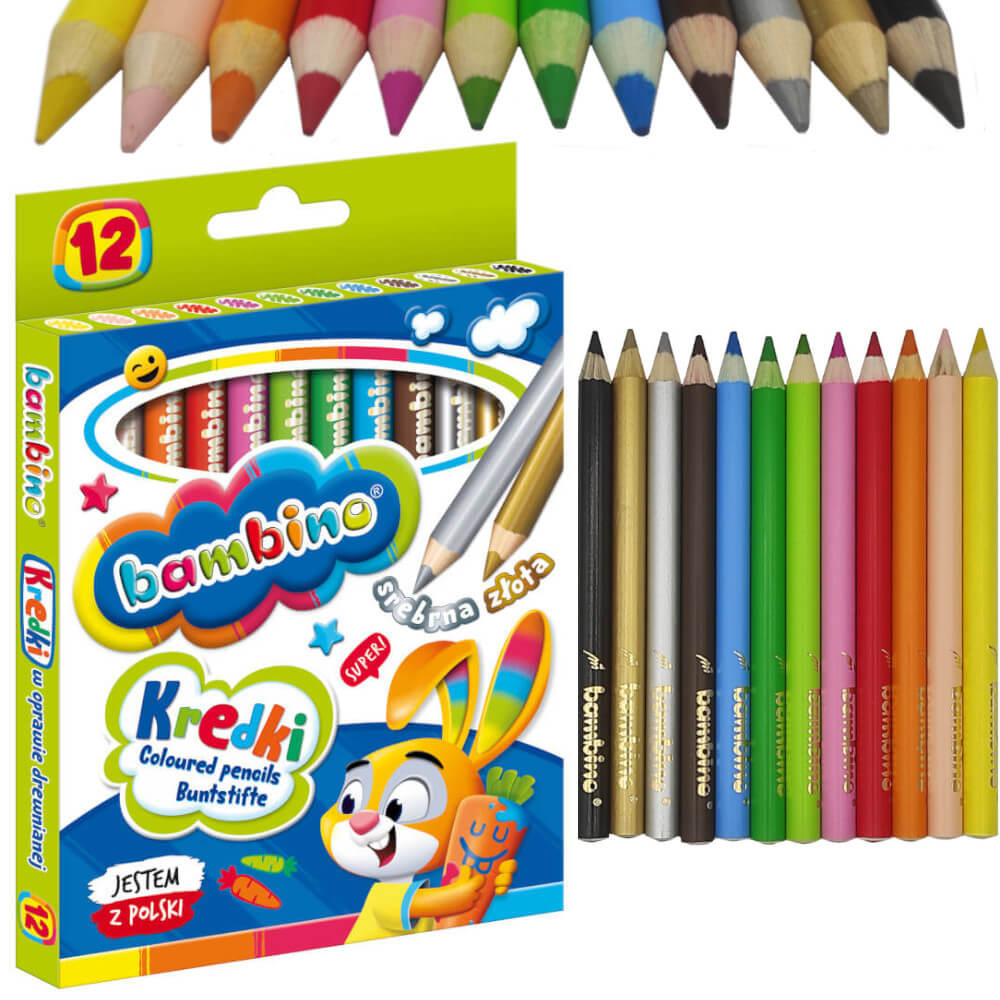 🖍️ Kredki BAMBINO w oprawie drewnianej – 12 kolorów, w tym złota i srebrna