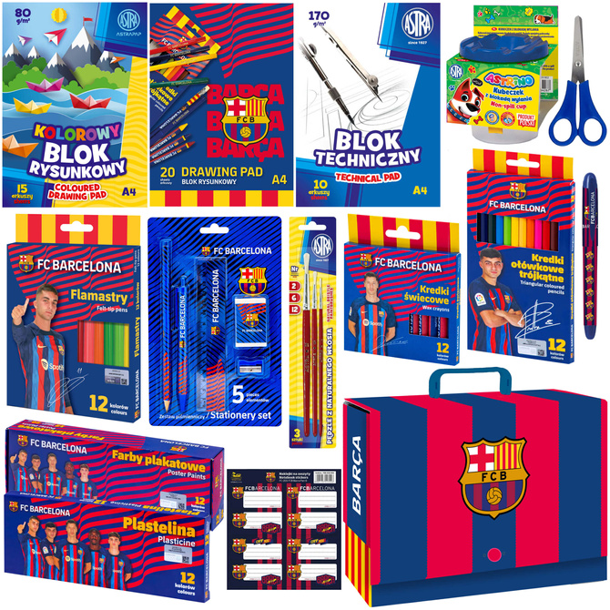 Wyprawka szkolna XXL FC Barcelona to kompletny zestaw artykułów szkolnych i plastycznych, stworzony z myślą o dzieciach, które kochają piłkę nożną i legendarny klub FC Barcelona. Idealny wybór na rozpoczęcie roku szkolnego, do szkoły podstawowej oraz na kreatywne zajęcia w domu.