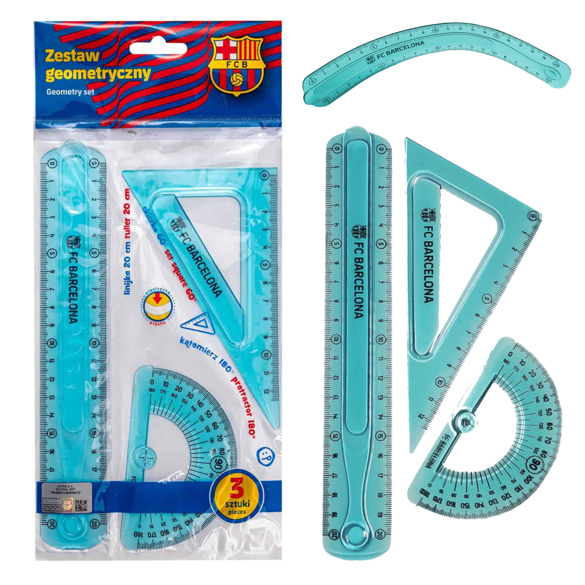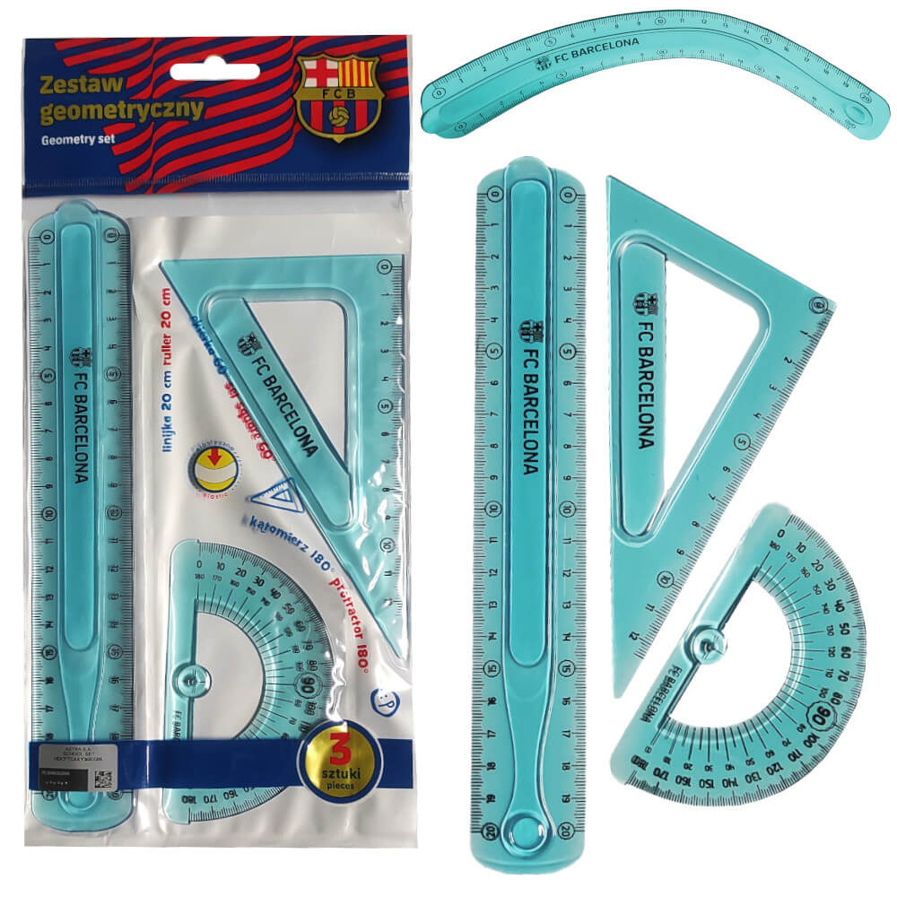 ✂️ Zestaw geometryczny elastyczny 3 elementy FC Barcelona- linijka, ekierka, kątomierz, odporny na pękanie