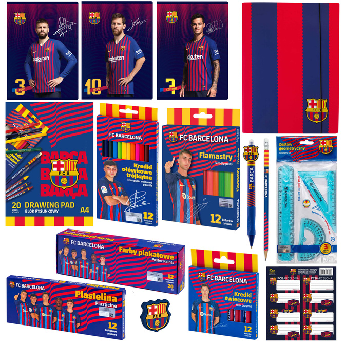 Wyprawka szkolna XXL FC Barcelona to zestaw artykułów szkolnych i plastycznych, stworzony z myślą o dzieciach, które kochają piłkę nożną i legendarny klub FC Barcelona. Idealny wybór na rozpoczęcie roku szkolnego, do szkoły podstawowej oraz na kreatywne zajęcia w domu.